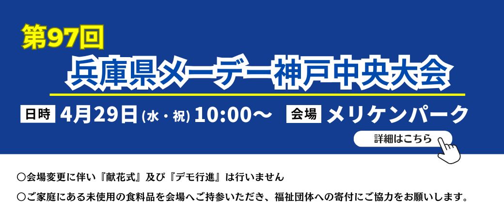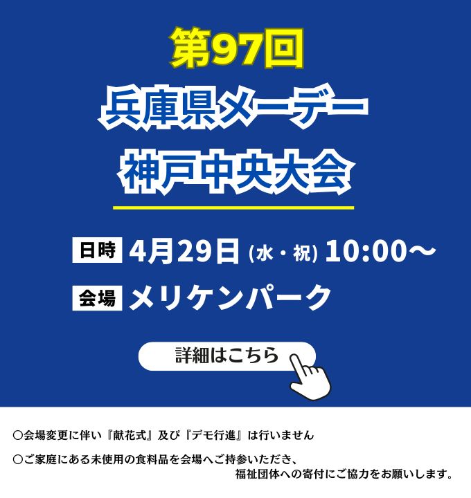 第97回兵庫県メーデー神戸中央大会情報№1 今回より、会場をメリケンパークへ変更して開催します。 会場変更に伴い、「献花式」および「デモ行進」は実施しません。 なお、今回も「フードドライブ」の取り組...