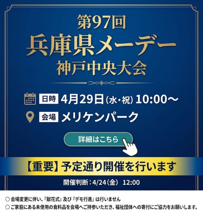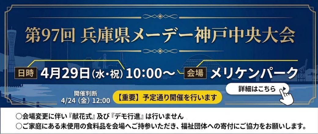 第97回兵庫県メーデー神戸中央大会情報№2 今回より、会場をメリケンパークへ変更して開催いたします。 会場変更に伴い、「献花式」および「デモ行進」は実施いたしませんので、あらかじめご了承ください。...