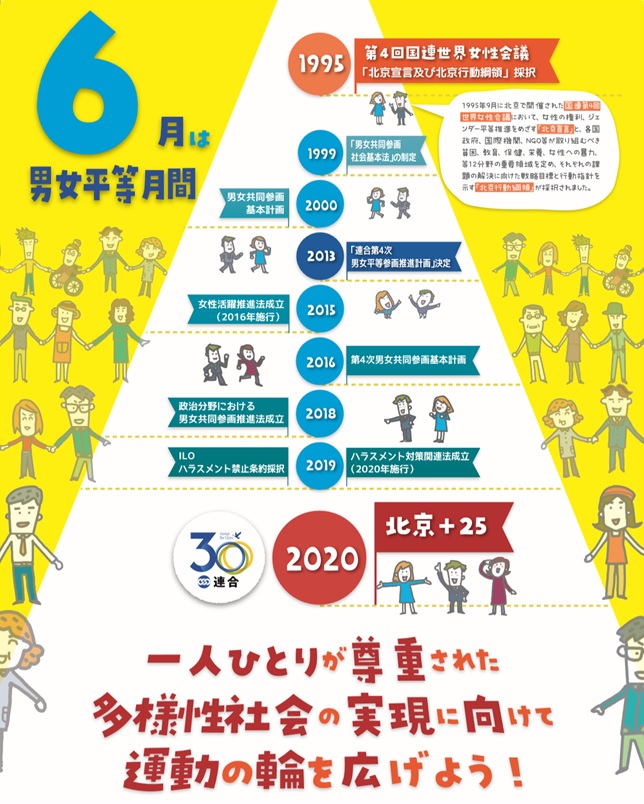 性別・年齢・国籍・障がい者の有無・就労形態などにかからわず、誰もが多様性を認め、互いに支え合う事のできる職場・社会の実現を目指します。その実現に向けて、男女平等参画をはじめとして、「真の多様性」に向けた法整備や職場環境の改善などの取り組みを推進していきます。