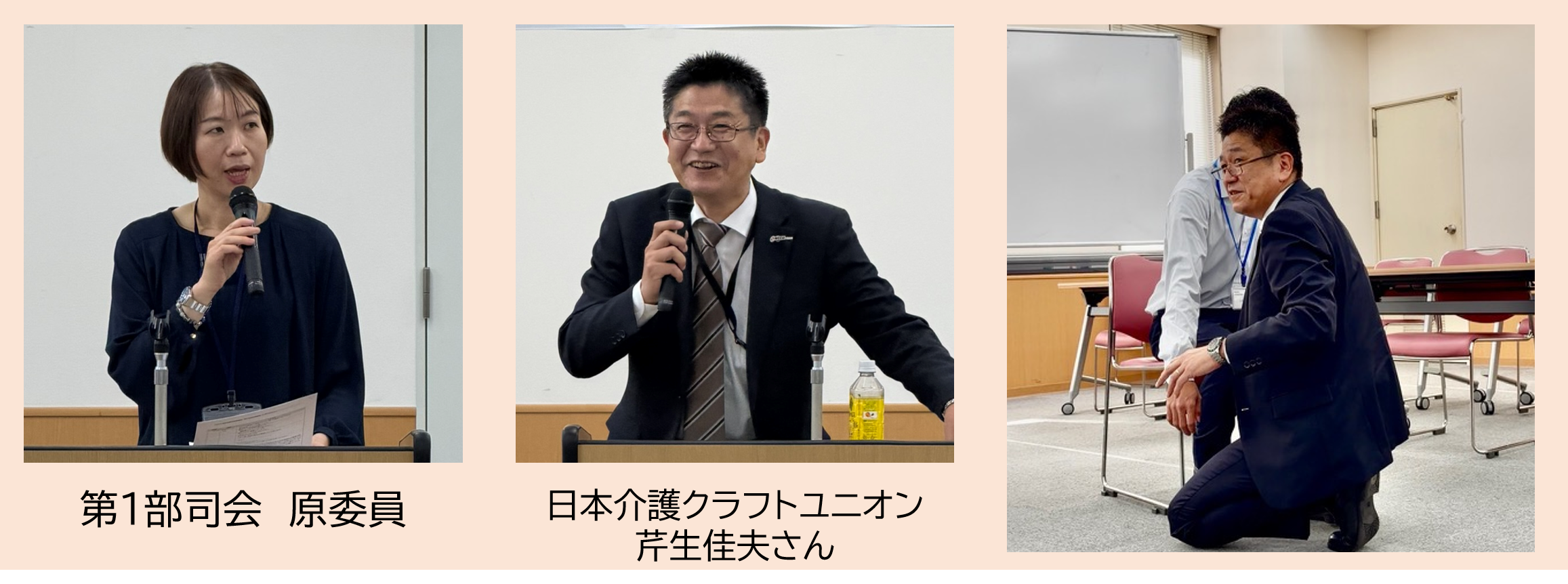 第1部の学習会の司会は原委員(電機連合)が行い、日本介護クラフトユニオン(UAゼンセン)より芹生佳夫さんをお招きし、「自分の身近な人に介護が必要な状態になったら」をテーマにご講演いただきました。介護保険制度の基本的な仕組みや、芹生さんが現場で感じてきたこと、利用者の方々との関わりなど、実践に基づいた具体的なお話を伺うことができました。