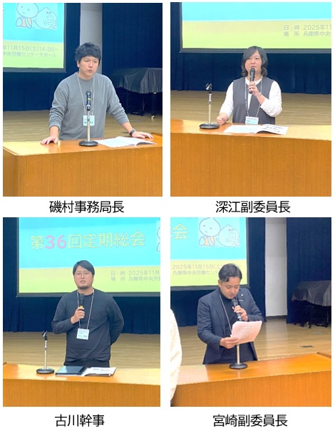 つづいて2025年度の活動内容については磯村 事務局長、深江 副委員長、古川 幹事から報告をおこないました。2026年度の活動方針、青年委員会会則の一部改訂については磯村事務局長、新役員選出を宮崎 副委員長から提案し、第36期の活動がスタートしました。