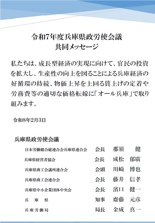 最後に「私たちは、成長型経済の実現に向けて、官民の投資を拡大し、生産性の向上を図ることによる兵庫経済の好循環の持続、物価上昇を上回る賃上げの定着や労務費等の適切な価格転嫁に『オール兵庫』で取り組みます」とする共同メッセージが確認されました。