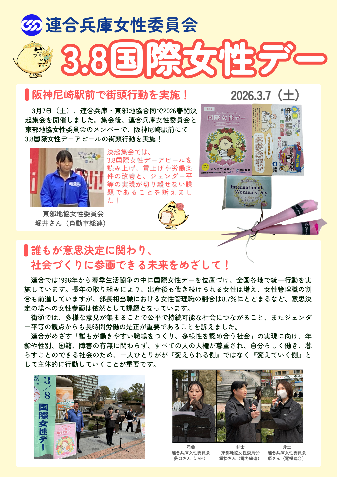 今年は、2026年3月7日(土)、東部地協女性委員会の皆さんとともに阪神尼崎駅前で街頭行動を実施しました!